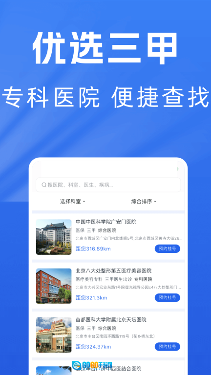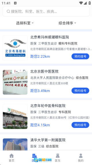 2、进入医院栏目后,系统会显示距离您最近的医院列表,您也可以通过搜索栏查找科室、医生等信息,之后选择预约挂号选项即可完成操作。