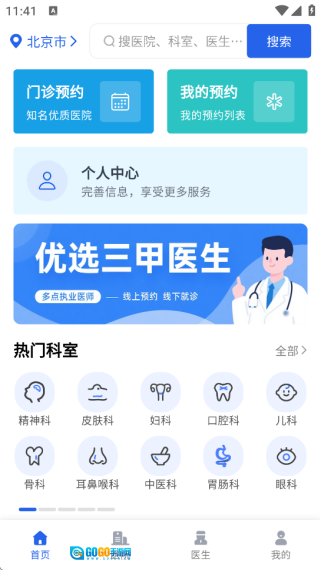 进入软件后,系统会依据你的定位显示当地医院;在个人中心完善信息后,即可查找对应医院的医生进行挂号、查看科室等操作。