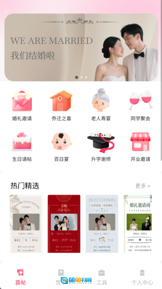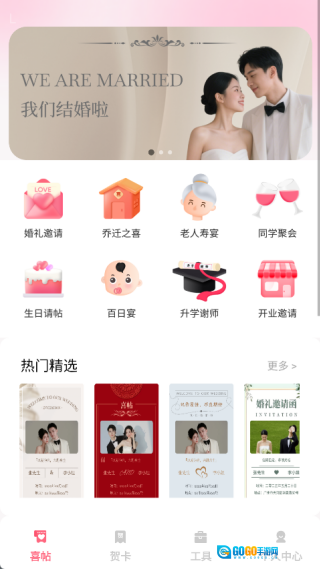 1、喜贴页面设有婚礼邀请、乔迁之喜、老人寿宴、同学聚会、生日请帖、百日宴、升学谢师、开业邀请等多个版块,另外还包含热门精选的模板。