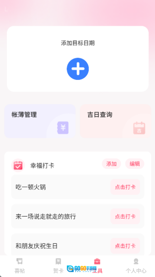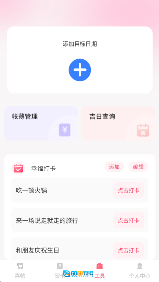4、在工具页面中点击“+”号添加目标日期,此外还能进行账簿管理、吉日查询以及幸福打卡操作。