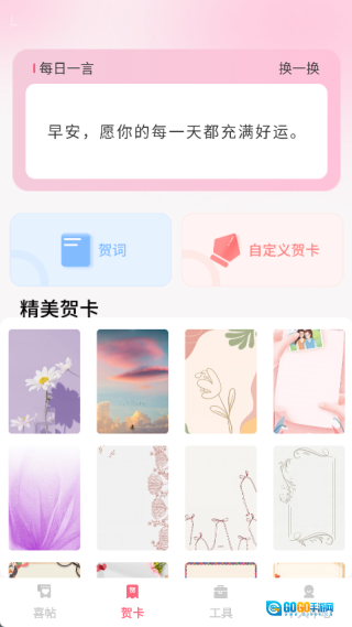 3、贺卡页面设有贺词、自定义贺卡版块,同时提供大量精美贺卡模板供用户挑选。
