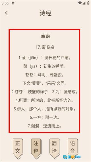 4、进入篇目详情页面后,能够查看《蒹葭》等诗篇的注释等相关内容。