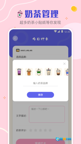 南京今日水印相机网络科技有限公司推出了一款名为“奶茶”的日记应用,这款应用专为奶茶爱好者打造。它的功能十分实用,既能让用户记录下每一杯品尝过的奶茶,又能帮助用户清晰地了解自己喝奶茶的习惯。借助这款应用,用户可以便捷地记录下自己钟爱的奶茶品牌、偏好的小料搭配以及喜欢的口味类型。