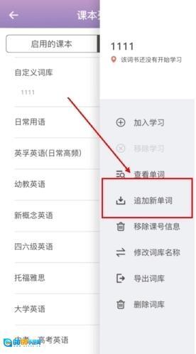 2、接着右侧会弹出一系列选项,我们要点击【追加新单词】;