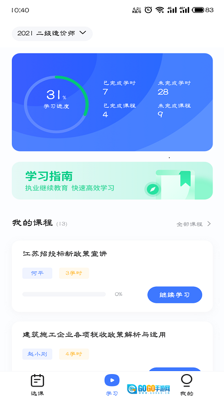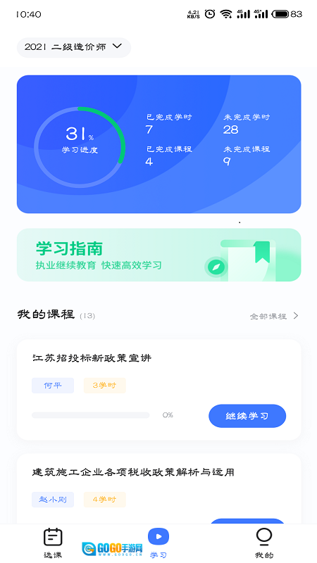 造价远程教育安卓版,江苏省的工程造价从业者都选择在这里学习。课程学习变得更轻松,执业继续教育也能快速高效地完成。这里有专业的学习指南,还精选了大量优质课程,内容十分齐全,让在线学习更加便捷简单。