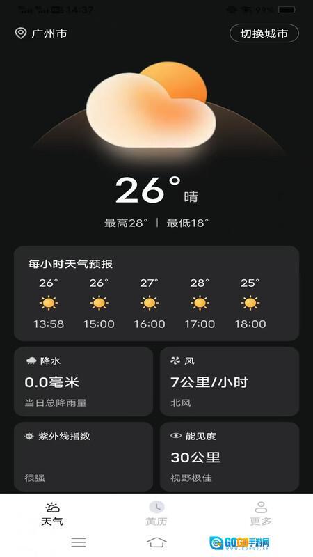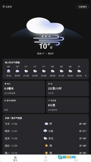 2、天气页面呈现了当地每个整点的温度变化状况,同时提供未来一周天气查询服务。