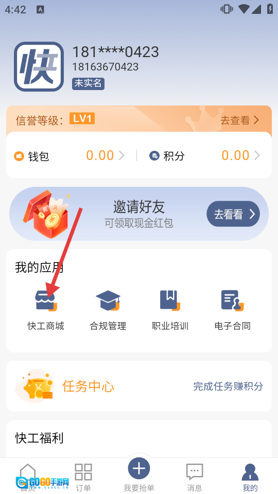 2、在个人页,找到并点击进入【快工商城】。