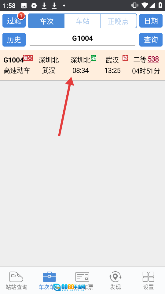 4、在查询结果里找到G1004次列车,点击进入它的详情页面。