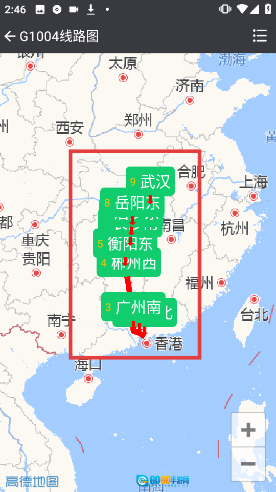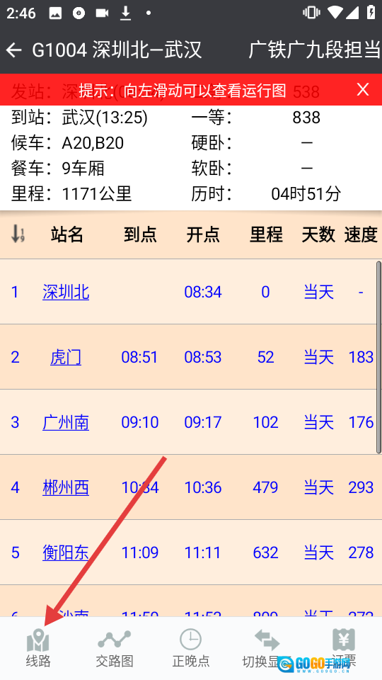 3、进入G1004车次的详情页面后,点击页面底部的【线路】按钮,就能查看该趟车次的线路图了。