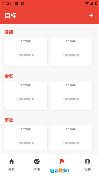 在目标版块中,你能够依据健康、事业、金钱等类别来设定各类不同的目标。