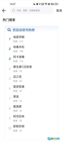 首先我们点击说明书窗口,进入后能清晰看到各类热门药品的使用说明书及其查询热度;通过上方搜索栏,还可以快速查找目标药品说明书,进而了解它的用法和注意事项。