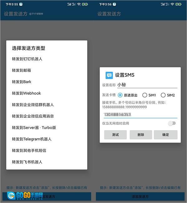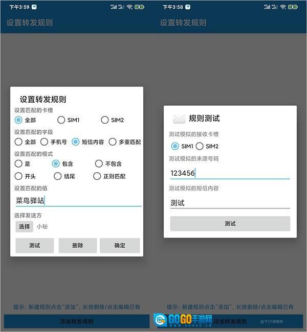 为了确保能准确转发短信内容,你可以先进行测试,随意输入短信内容和号码来源即可。