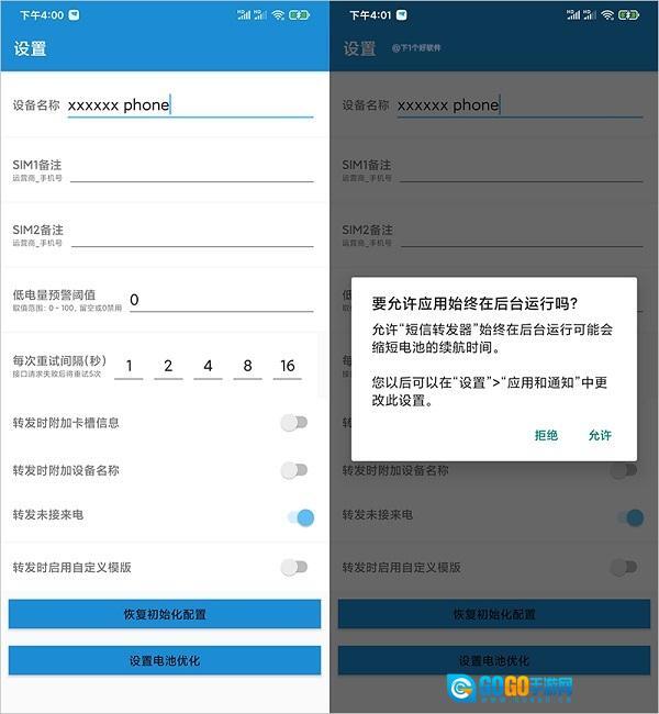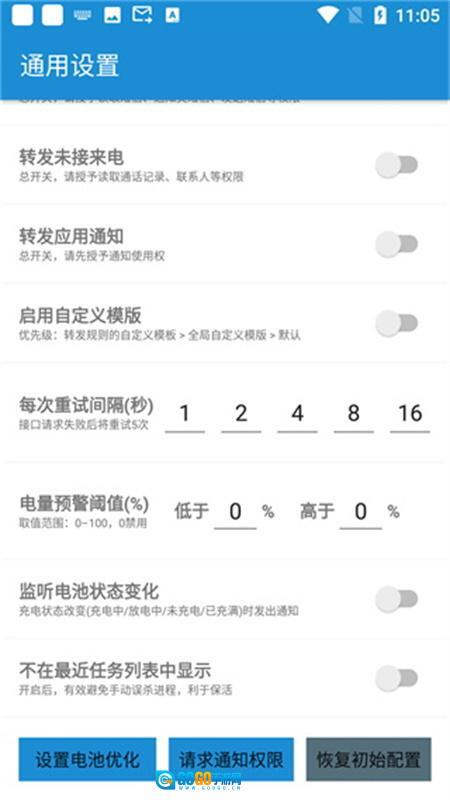 在功能设置上,支持对安卓设备名称、SIM卡槽备注进行配置,还能开启低电量预警通知、未接来电转发功能,以及自定义转发启动模板。此外,为避免SmsForwarder进程被系统终止,建议开启应用的后台持续运行权限。
