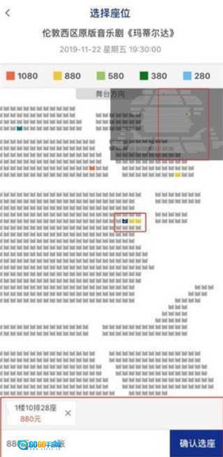 2、确定好演出时间后,点击“选座购买”按钮进入座位选择界面,选好座位后再点击“确认选座”,即可进入订单确认页面。
