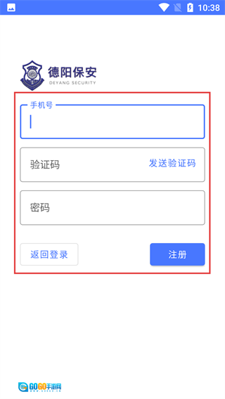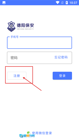 2、进入【德阳保安】登录页面,填写【手机号】和【密码】后点击【登录】按钮即可登录;若还没有账号,可点击【注册】按钮进入注册流程。