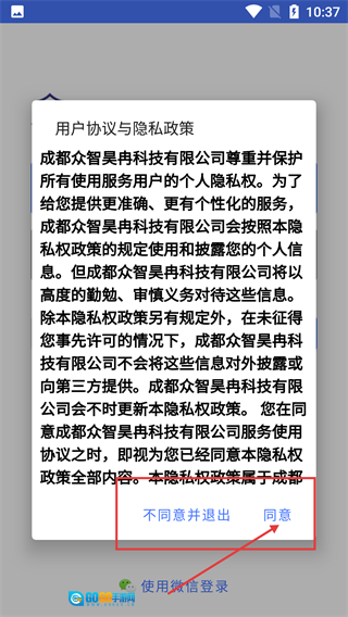 1、在【用户协议与隐私政策】的弹窗中,点击【同意】按钮即可进入后续界面,此外也可以选择【使用微信登录】。