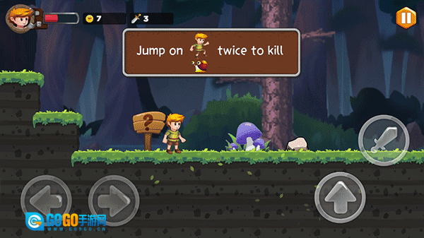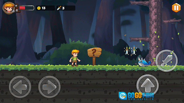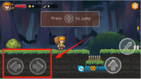2、我们采用经典的操控模式,通过左下角的按键来控制角色的左右移动,右下角则负责跳跃动作与金币的拾取。一旦你成功获取武器,发射按钮便会自动解锁显示。