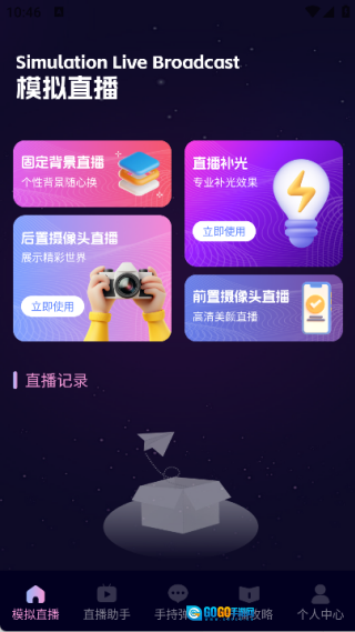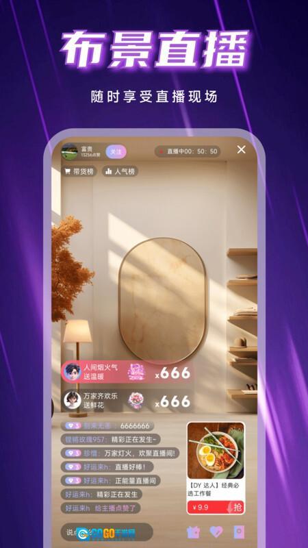 3、支持多样化布景直播,支持固定背景选择,还能模拟多种直播模式,同时搭配手持弹幕效果与互动调整功能。