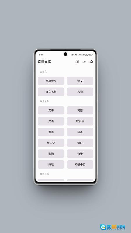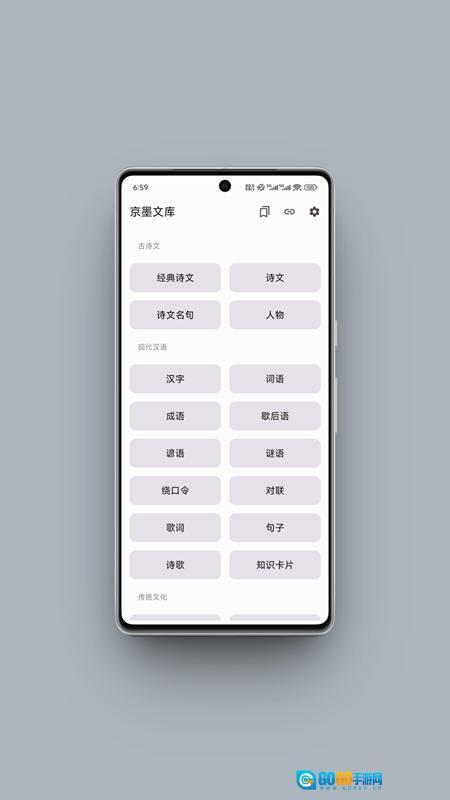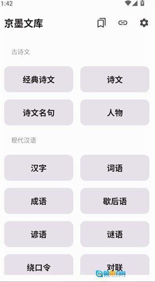 1、打开京墨文库后,可在首页挑选诗文、成语、对联或者谜语模块,进而开启学习之旅。