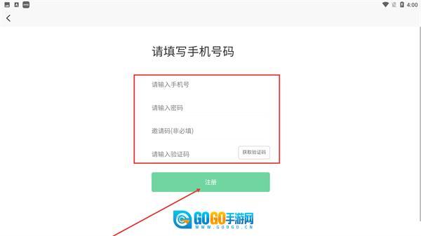 3、注册时,需依次填写【请输入手机号】【请输入密码】,邀请码为选填项,之后获取并填入验证码,点击【注册】按钮即可完成注册操作。