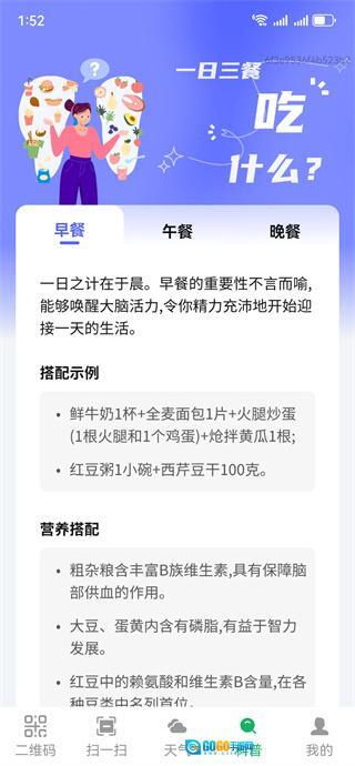 2、把生活服务辅助功能融入其中,在扫码工具的基础上增添天气查询、一日三餐饮食搭配建议等功能,以此提高应用的实用价值。