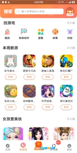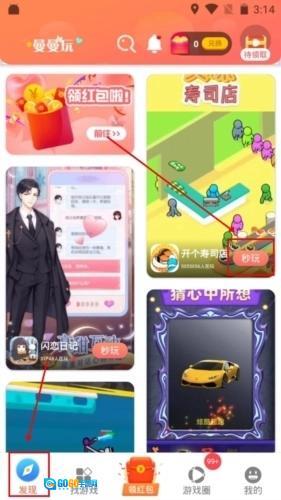 1、首先打开曼曼玩,进入后会直接跳转到首页的【发现】板块,在该板块中随机挑选一款感兴趣的游戏,接着点击游戏名称右侧的【秒完】按钮;