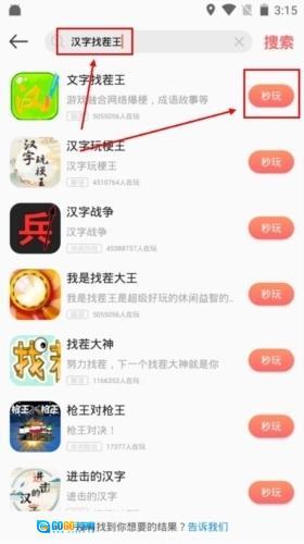 2、在此处输入你想玩的游戏名称,点击搜索后会显示大量相关游戏,接着点击目标游戏右侧的“秒完”按钮即可。