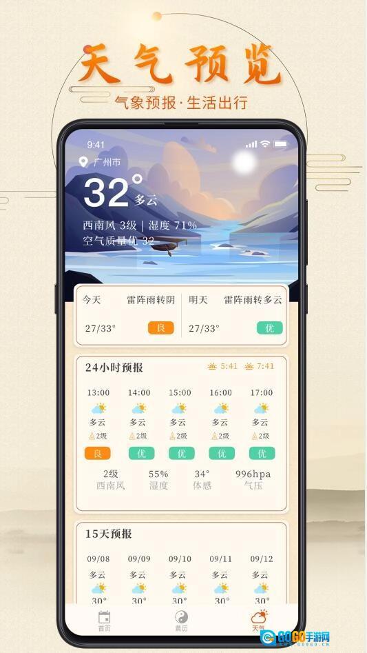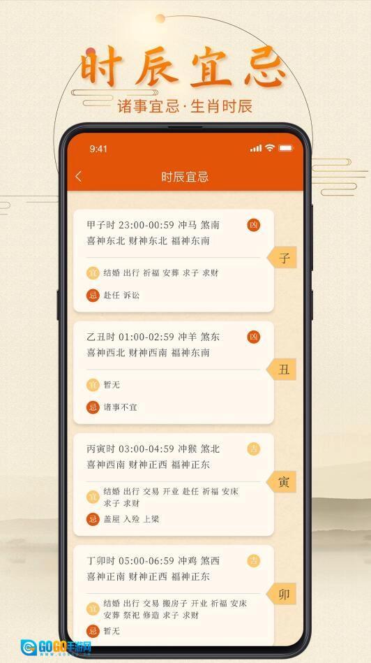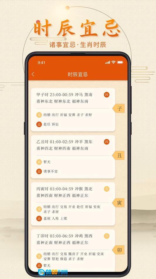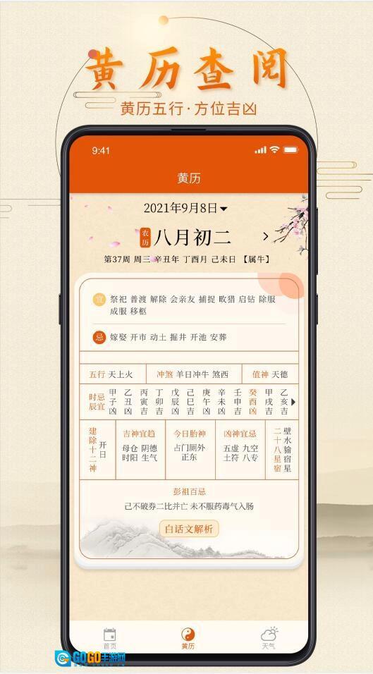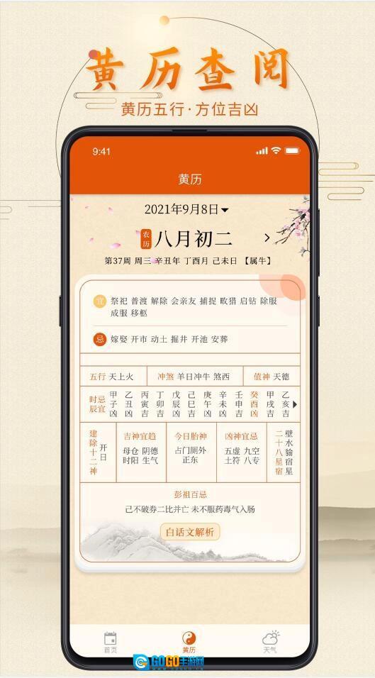 3、黄历:整合了完备的老黄历内容,清晰呈现农历节气的更替,每日的适宜与禁忌事项,吉神和凶神的方位及宜忌,天干五行的对应关系,还同步展示公历、农历、干支历等多种历法信息;