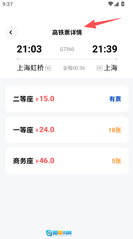 2、点击目标车次,查看高铁票详情,了解各座席的价格和票量情况。