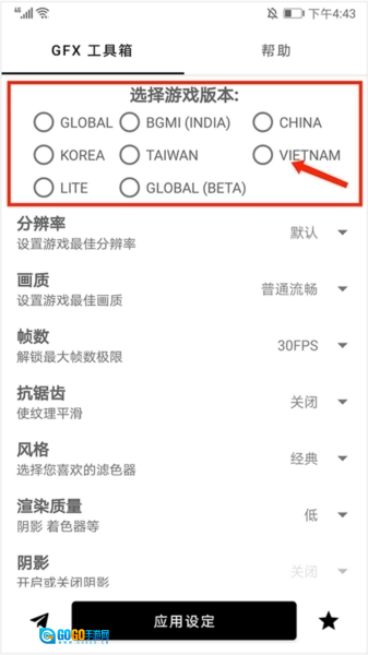 1、打开gfx工具箱,进入应用主界面后,先选择要修改的游戏版本,可选项有国服、越南服、印度服、韩服、台服等共八个版本,这里我们以【越南服】来举例说明。