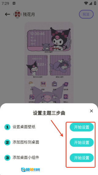 4、这里有三个步骤,第一步是设置桌面壁纸,第二步是将图标添加到桌面,第三步是添加小组件,按照这三个步骤依次点击开始设置,就能完成安装。