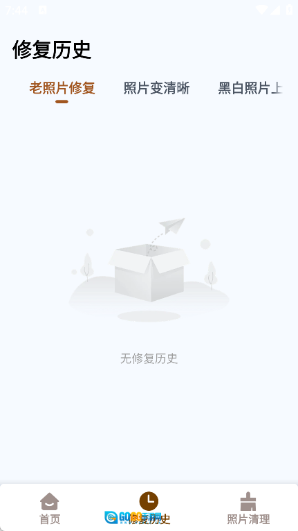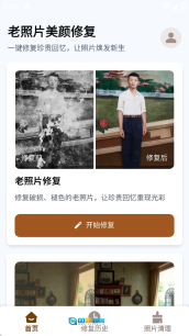 首页配备了老照片修复、照片清晰度提升、黑白照片上色等功能。