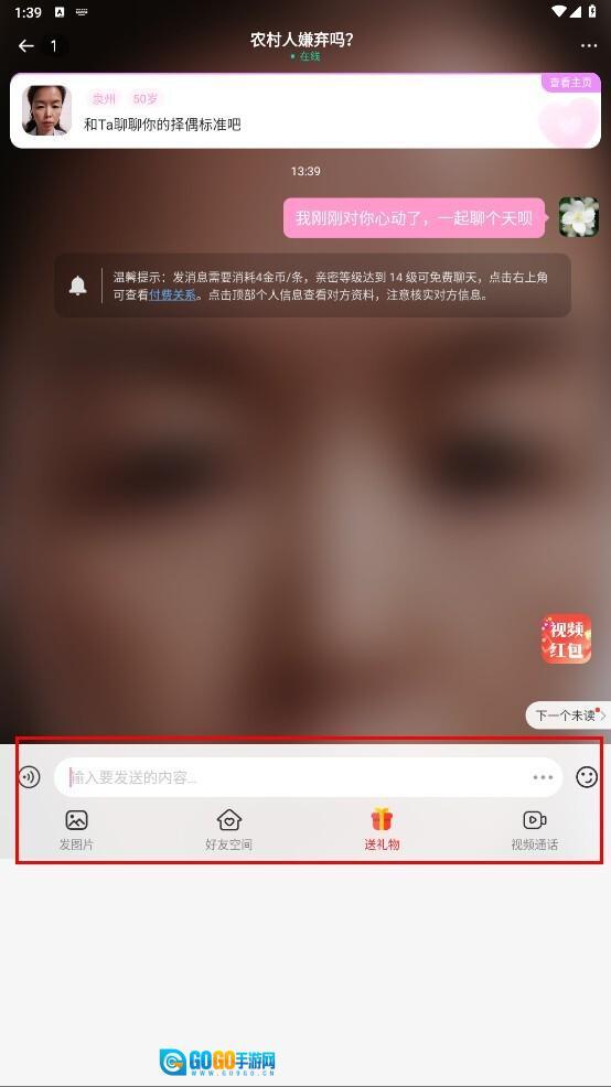 3、在聊天界面中,用户不仅可以输入内容进行发送,还能够使用发送图片、赠送礼物等多种功能。