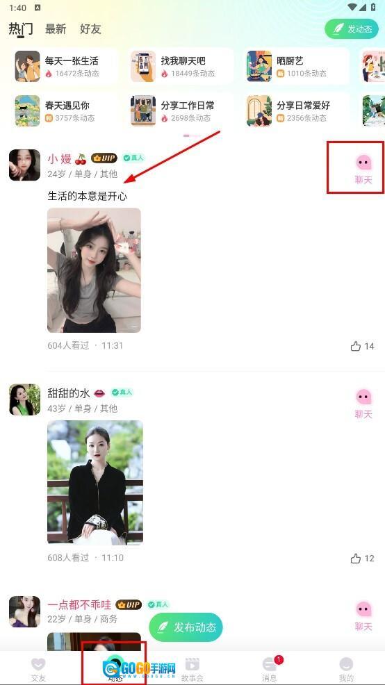 4、点击底部的【动态】功能按钮,进入动态页面后,找到目标用户,点击其旁边的【聊天】功能按钮,即可与该用户进行聊天。