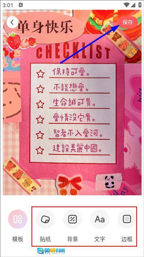 5、进入手账编辑界面后,能够添加贴纸、背景、文字、边框等元素,点击右上角的保存按钮,就能完成手账的制作。