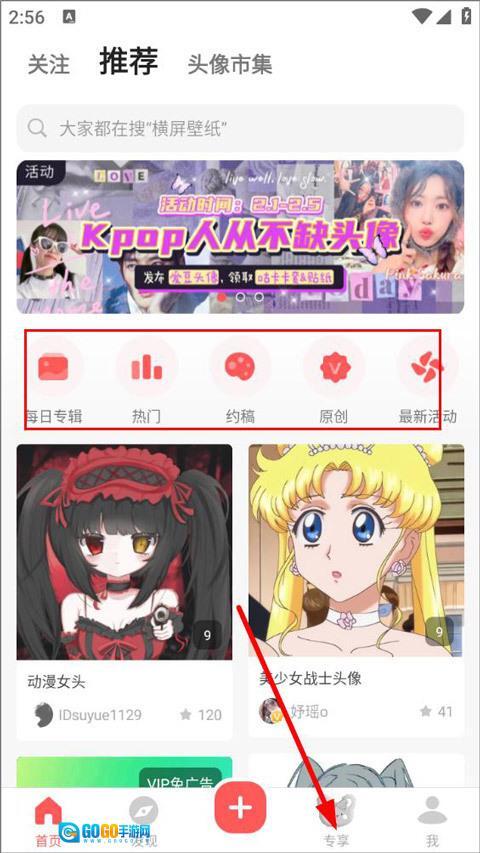 1、打开堆糖应用,登录账号后进入首页,首页设有每日专辑、热门、原创等不同板块,接着点击“专享”选项。