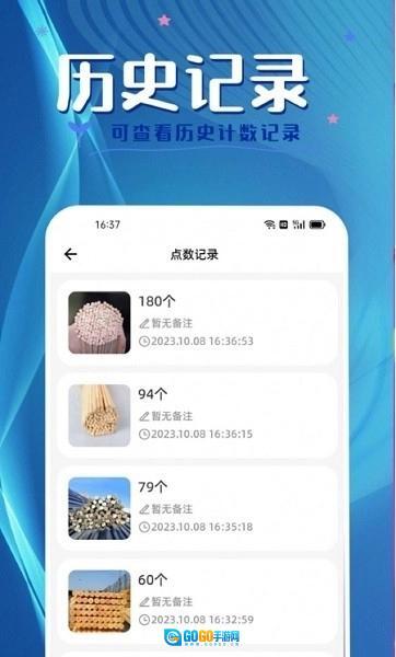 拍照计数王具备多材料计数功能,可用于竹签、钢管、钢筋、圆木、方木、珍珠等物品的点数,并且支持历史记录查询。