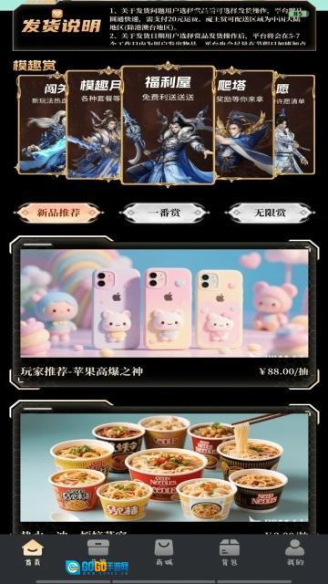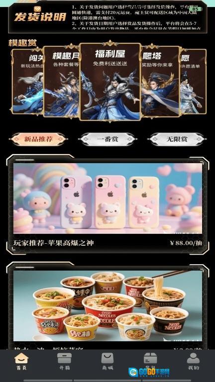 首页设有众多新品推荐商品,同时包含一番赏、无限赏等功能板块。