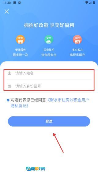 3、进入登录页面后,依次输入姓名与身份证号,勾选同意隐私协议,再点击登录按钮,即可完成账号登录流程。