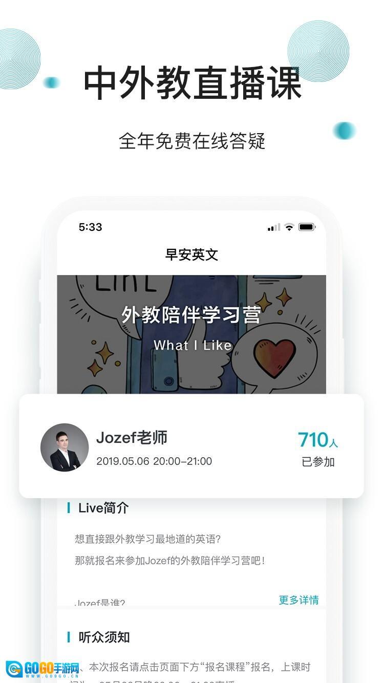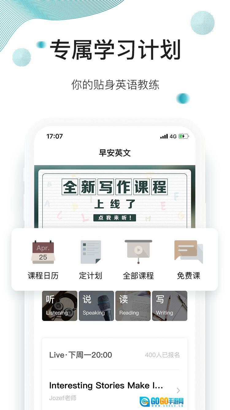 专注于提升英语水平的学习工具——《早安英文》。它配备了完整的英语学习配套课程,还能提供定制个人专属学习计划、中外教课后答疑等实用的英语学习服务,助力用户增强英语口语能力。