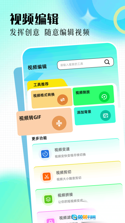 3、拥有视频变速、裁切、拼接、倒放、格式转换、添加背景、提取片段等功能,并且支持视频转GIF。