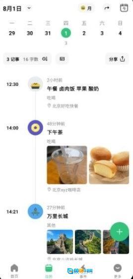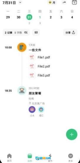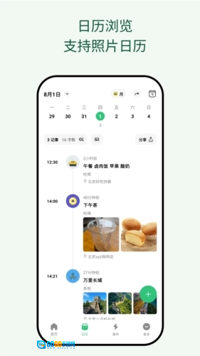 日历:按天浏览记录项,左右滑动切换日期,以时间线方式呈现每一天的记录。