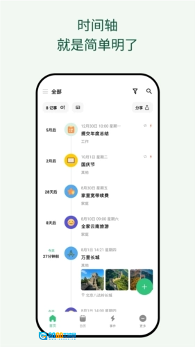 首页:默认展示所有记录项的时间线,让您一览所有重要时刻。