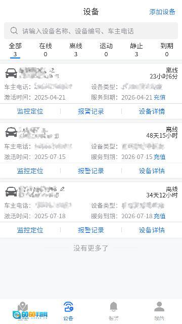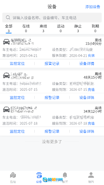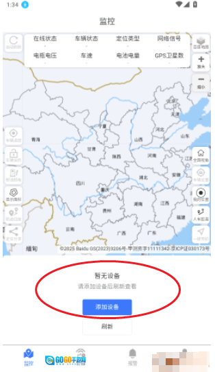 9.设备完成绑定后,您可以在“监控”页面查看车辆的实时状态,包括在线/离线状态、具体位置以及电量等信息。