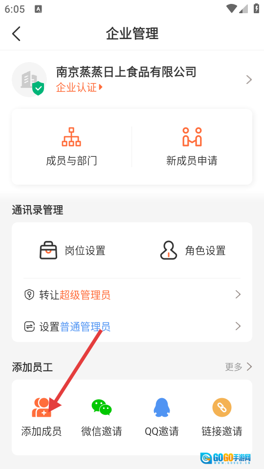 3、进入企业管理页面后,点击【添加成员】按钮,即可进入添加成员的操作页面。