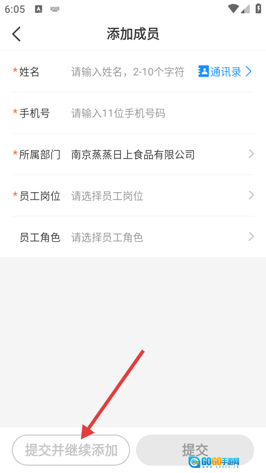 4、进入添加成员页面后,填写相关信息并点击【提交并继续添加】按钮,即可完成成员添加操作。