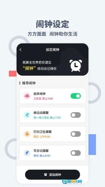 4、智能闹钟设定:任意设置,让生活更加精细,从起床到入睡,每一步都掌握在手。