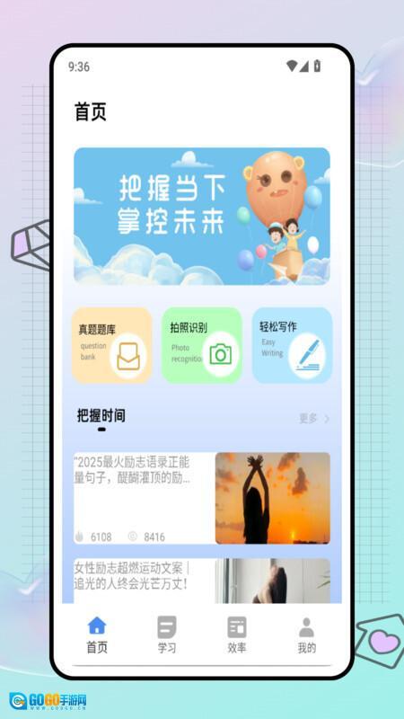 首页整合了丰富的题库资源,支持一键快速浏览,同时配备了便捷的轻松写作工具与实用的拍照搜题功能。