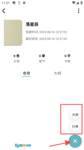 4、点击右下角的【+】按钮,新建“大纲”与“分卷”,填写好名称后,即可着手创作。