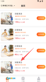 1、具备家政服务展示功能,涵盖深度清洁、日常保洁等服务选项,支持查看各服务的价格、销量等相关信息。